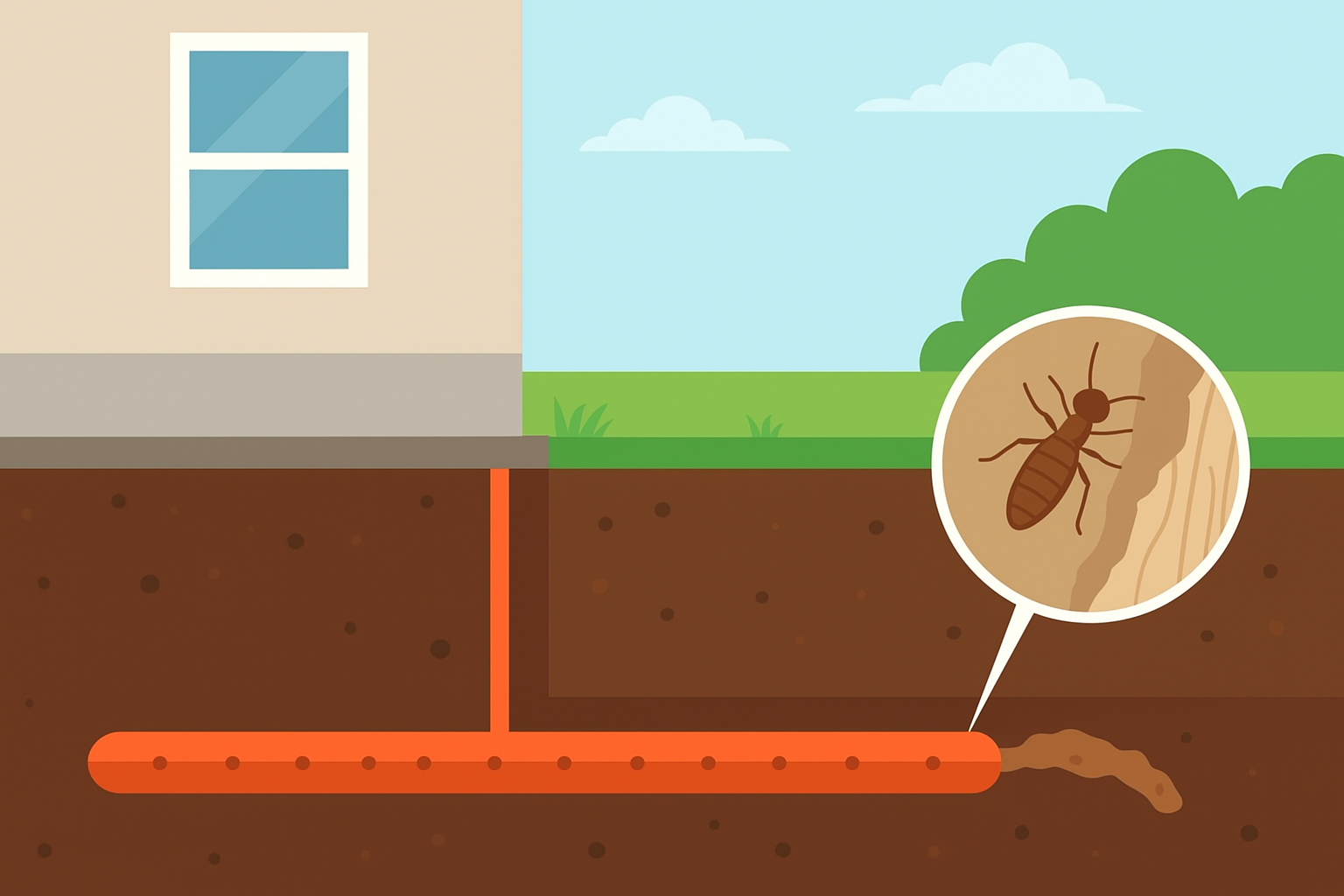 An Anti-Termite Reticulation Piping System is a network of special perforated pipes laid under or around a building’s foundation/flooring that lets you inject termiticide periodically; this creates a chemical barrier in the soil to prevent termites from entering the structure.